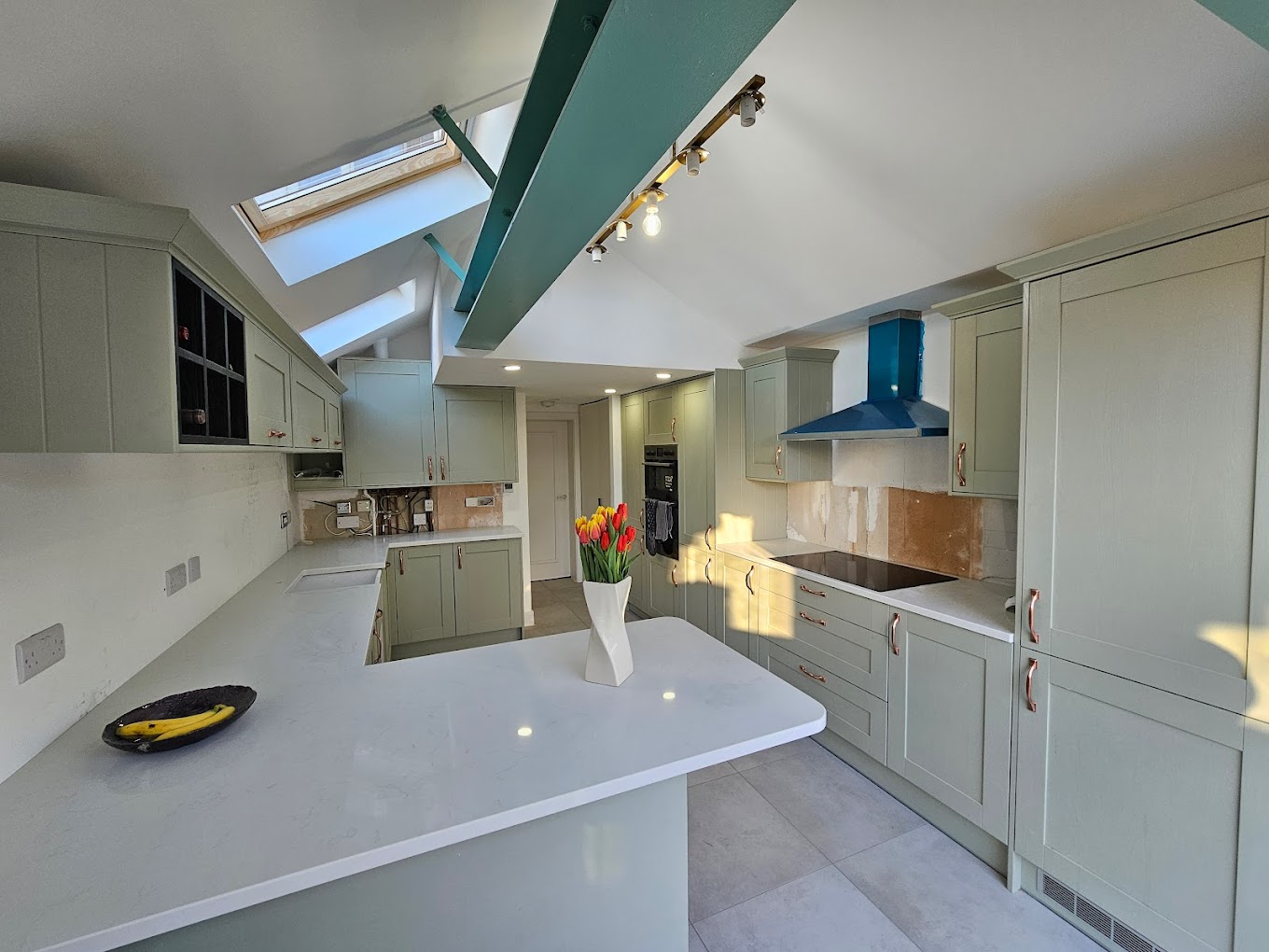The new layout features a bright and airy open-plan space with a breakfast bar, exposed structural beam, and a high, sloped ceiling that adds character and height. Underfloor heating throughout ensures the space feels warm and inviting—combining modern comfort with architectural charm.