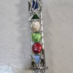 This decorative vintage mezuzah case is intended for placement on a door frame in accordance with tradition. The elongated form is enriched with coloured glass inlays in red, green and soft neutral tones, framed by geometric enamel-style elements that give the piece strong visual presence.